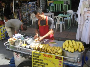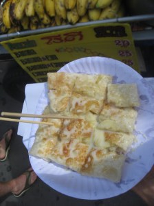 After nearly 40 hours of travel (Chicago -> Kansas City -> Los Angeles -> Taipei -> Hong Kong -> Bangkok), I arrived in the heat and humidity of Bangkok. After finding a room for the night ($6), I immediately set off to Khao San Road in search of some banana roti, which is pictured here. This is my favorite Thai snack by far (and totally for the tourists, so its authenticity can be argued, but I don’t care because it’s downright delicious). I ran some errands (bought a guidebook and a jump drive) and had dinner with a guy I met on the bus in from the airport. For all you LOST fans out there, this guy was literally a doppelganger for Charlie from the show. I went to sleep early and woke at an ungodly hour (thank you jet lag). The next day I just chilled in Bangkok with a couple of guys that I met. We spent the day eating, drinking and talking. It was very relaxing and much needed before my 24 hour bus ride to Penang, Malaysia.