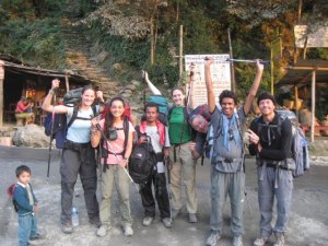Photos are of our group finishing the trek (relieved to be done!), me crossing a bridge, photographers at the Poon Hill sunrise and me showing some pictures I had taken of them to some local children.